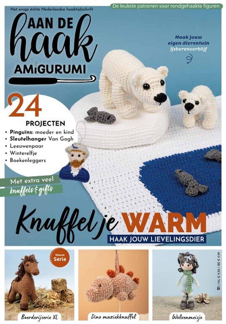 De nieuwe editie van Amigurumi Magazine 21 staat vol met knuffelbare vriendjes die perfect zijn als cadeau of als nieuwe aanwinst voor jezelf. Met het thema Knuffel je warm vindt iedereen wel een lievelingsknuffel die bij hem/haar past: van de grappige Rockhopper pinguïns tot het leeuwenpaartje, van winterelfje tot wolvenmeisje. Of haak leuke gifts: van muziekknuffel tot grappige boekenleggers, van de olijke Kerstbrengers tot de kunstzinnige Vincent van Gogh-sleutelhanger. Jouw perfecte haakcadeau wacht!